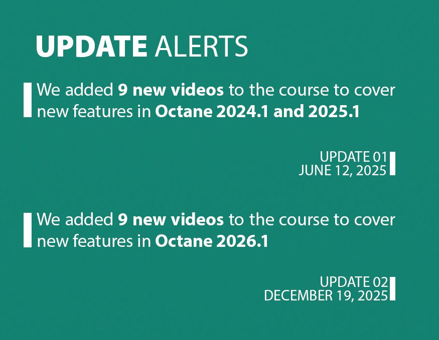 In the next section of the course, we’ll explore Octane materials and nodes. Not only will you learn about all the specific Octane materials, but you’ll also gain a solid understanding of the core shading principles and advanced techniques in shader creation.