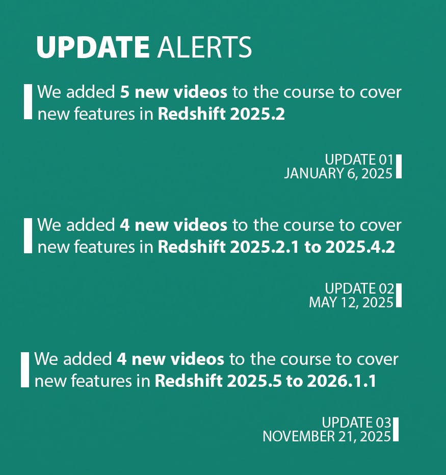We’ll keep the course updated; new videos will be added to the course whenever new versions of Redshift are released.